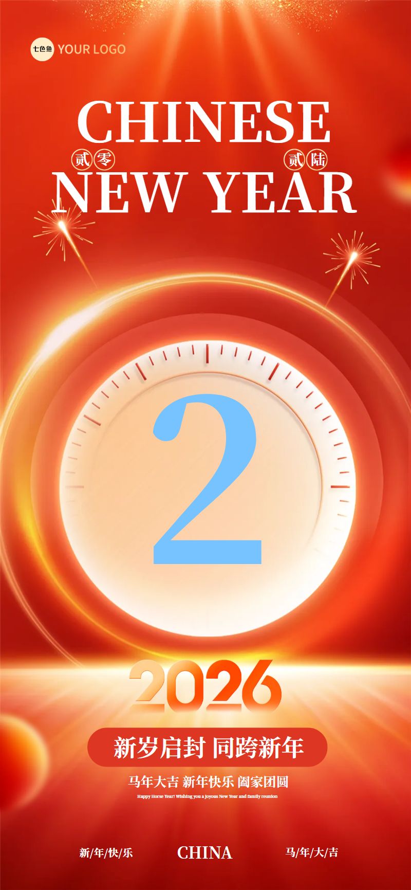 2026马年元旦倒计时2天全屏海报是设计师 笨笨的作品,模板尺寸为720*1280px,属于?社交>?手机海报模板 ,模板图片素材均支持免费下载,在线就近下单印刷。操作简单易懂,会打字就会做设计,七色鱼界面友好上手快,可适用于多种场景。七色鱼拥有海量模板素材,30万+模板免费用,行业覆盖丰富,全部模板只需拖拉拽,轻松改。满足中小型企业、创业公司、自媒体、学生和个体经营者的自助平面设计需求,还可进行云端储存管理、分享协作、营销传播、在线下单印刷等。