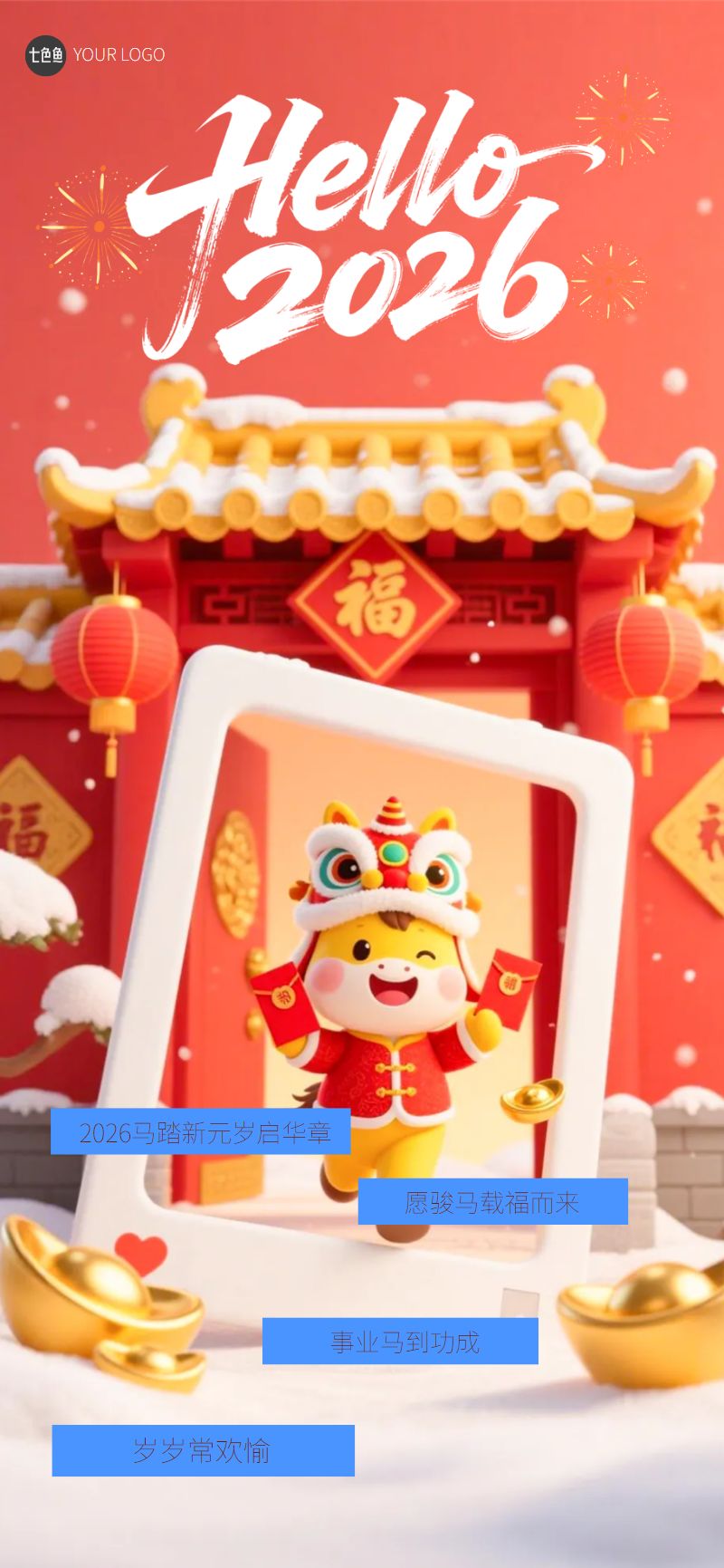 趣味马年元旦跨年你好2026祝福全屏海报.是设计师 笨笨的作品,模板尺寸为720*1280px,属于?社交>?手机海报模板 ,模板图片素材均支持免费下载,在线就近下单印刷。操作简单易懂,会打字就会做设计,七色鱼界面友好上手快,可适用于多种场景。七色鱼拥有海量模板素材,30万+模板免费用,行业覆盖丰富,全部模板只需拖拉拽,轻松改。满足中小型企业、创业公司、自媒体、学生和个体经营者的自助平面设计需求,还可进行云端储存管理、分享协作、营销传播、在线下单印刷等。